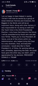 “Sono così felice di aver contribuito a salvare TikTok! Ora sarà di proprietà di un gruppo di grandi patrioti e investitori americani, i più grandi al mondo, e sarà una voce importante. Insieme ad altri fattori, è stato responsabile del fatto che io abbia ottenuto risultati così positivi tra il voto dei giovani nelle elezioni presidenziali del 2024.